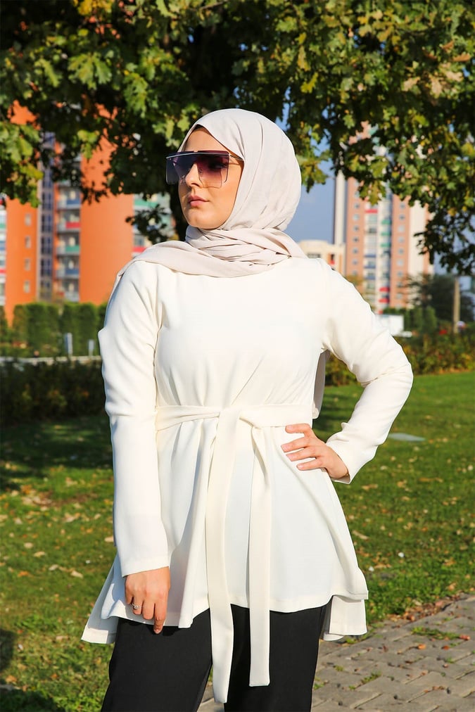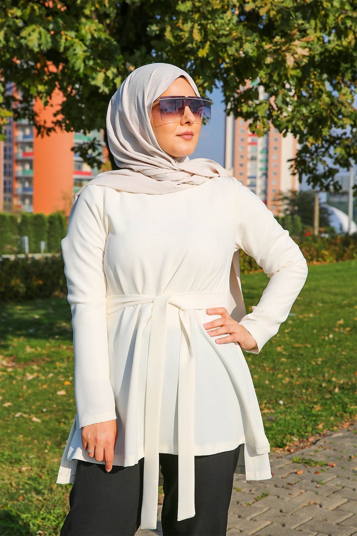 -Blouse opaque en crêpe légère, col rond, ceinture incluse.